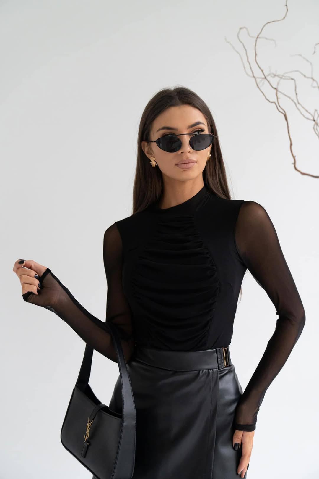 Bluză Elegantă Neagră cu Detalii Drapeate și Mâneci din Mesh