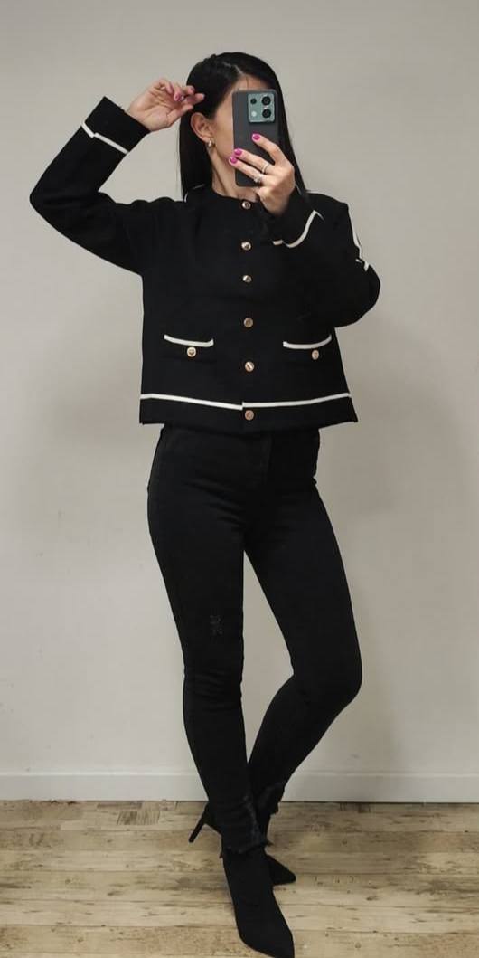 Acest cardigan elegant din material moale și confortabil adaugă un aer rafinat oricărei ținute. Cu un design simplu, dar sofisticat, și detalii albe la guler, buzunare și margini. Este perfect pentru zilele răcoroase de primăvară sau toamnă. Se potrivește ușor cu diverse piese vestimentare din garderoba ta.