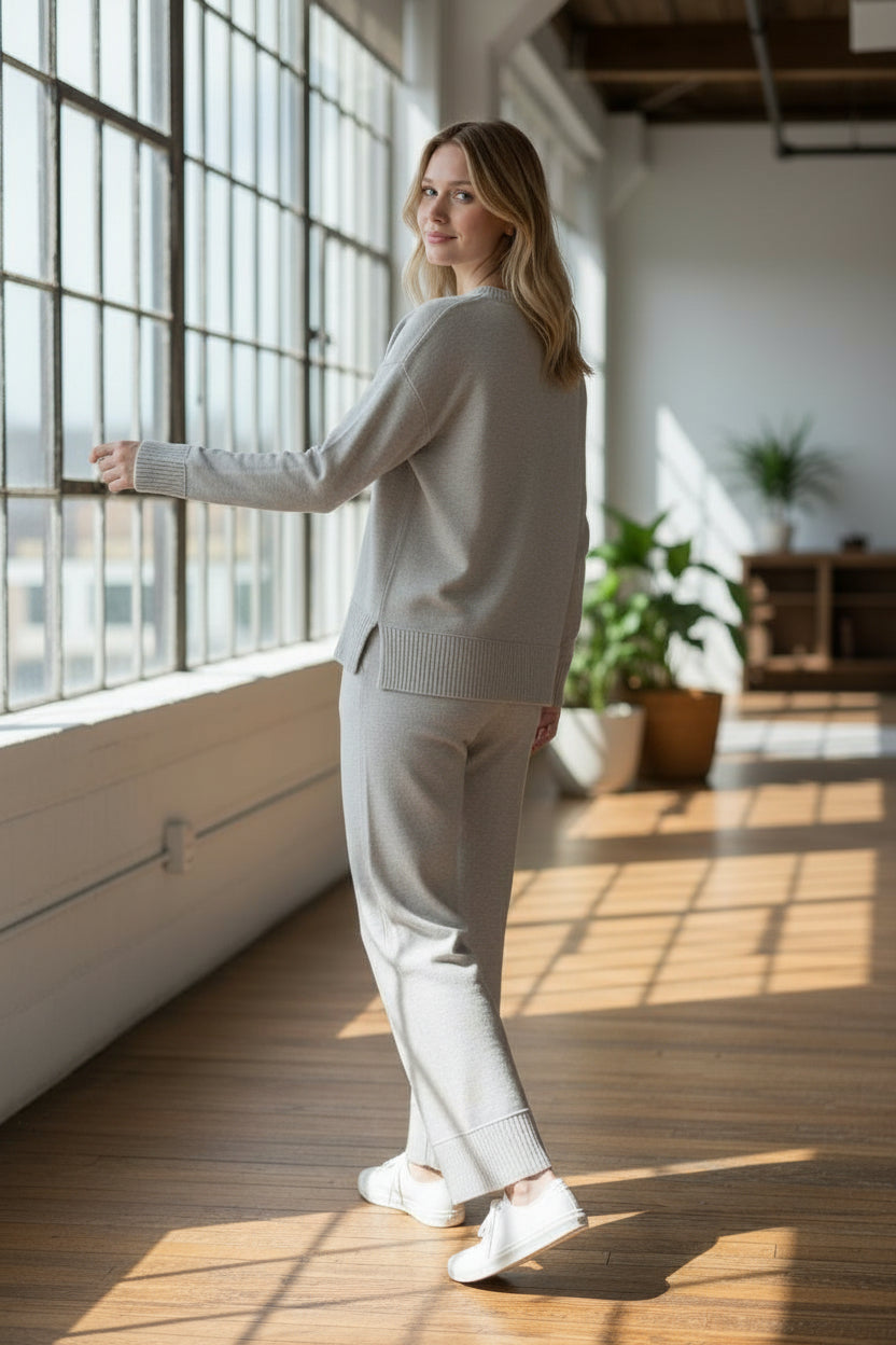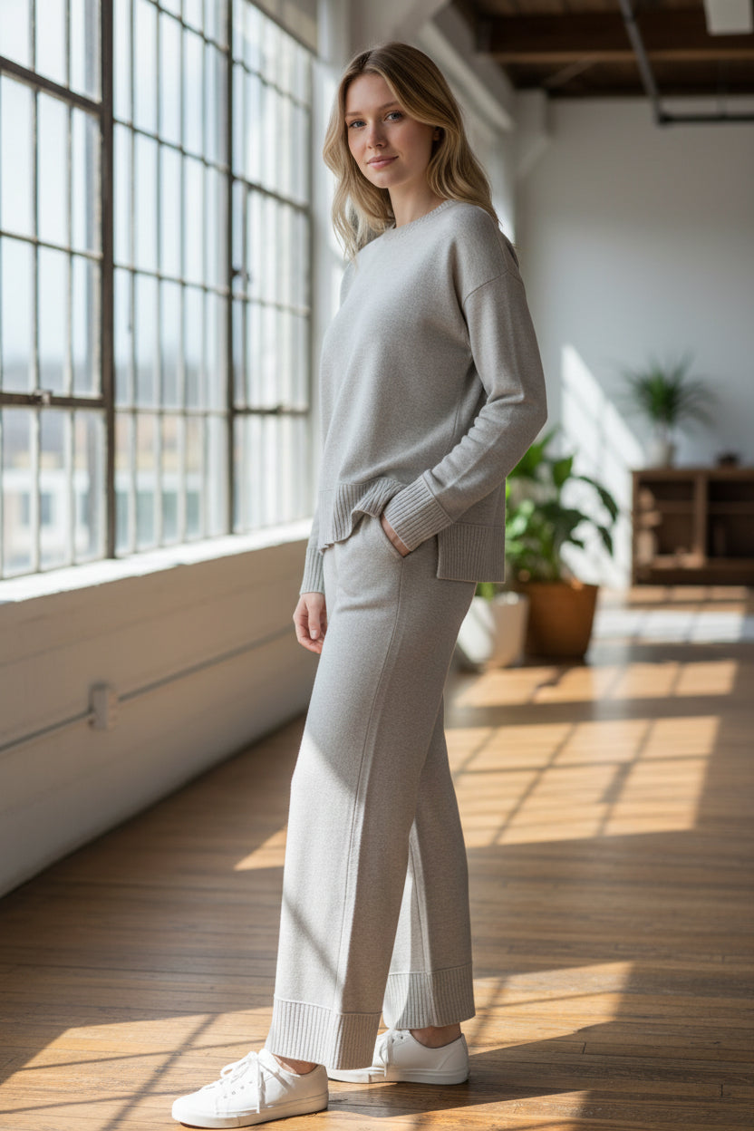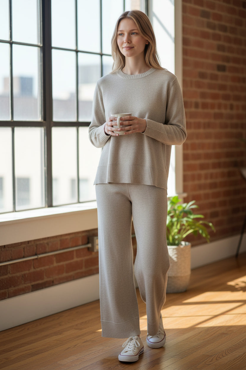 Acest compleu tricotat elegant și confortabil este perfect pentru momentele de relaxare acasă sau pentru ieșirile lejere. Confecționat dintr-un material fin și moale, setul include un pulover cu manșete și pantaloni largi care se potrivesc perfect oricărei siluete. Ideal pentru un look confortabil, dar stilat.