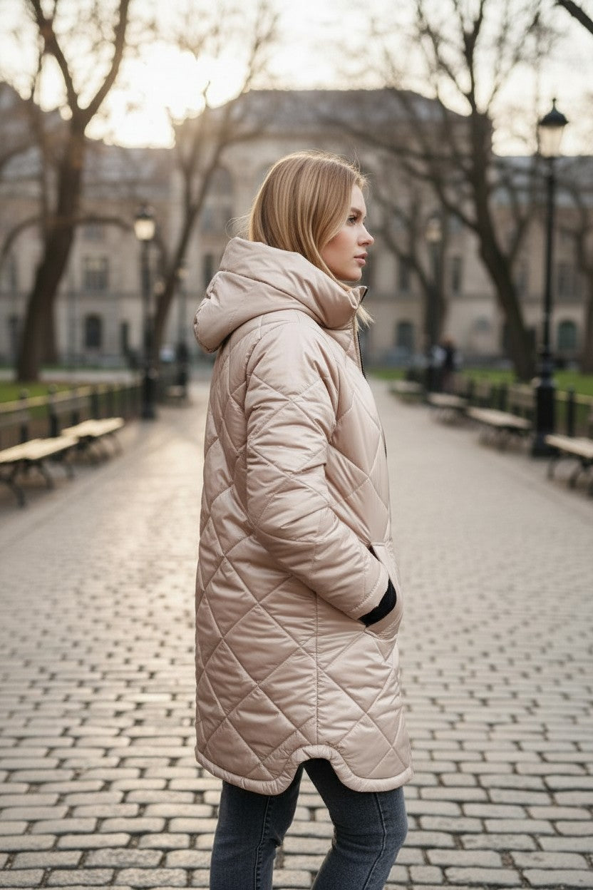 Geacă Matlasată Lungă cu Glugă și Mâneci cu Inserții Tricotate- Bej