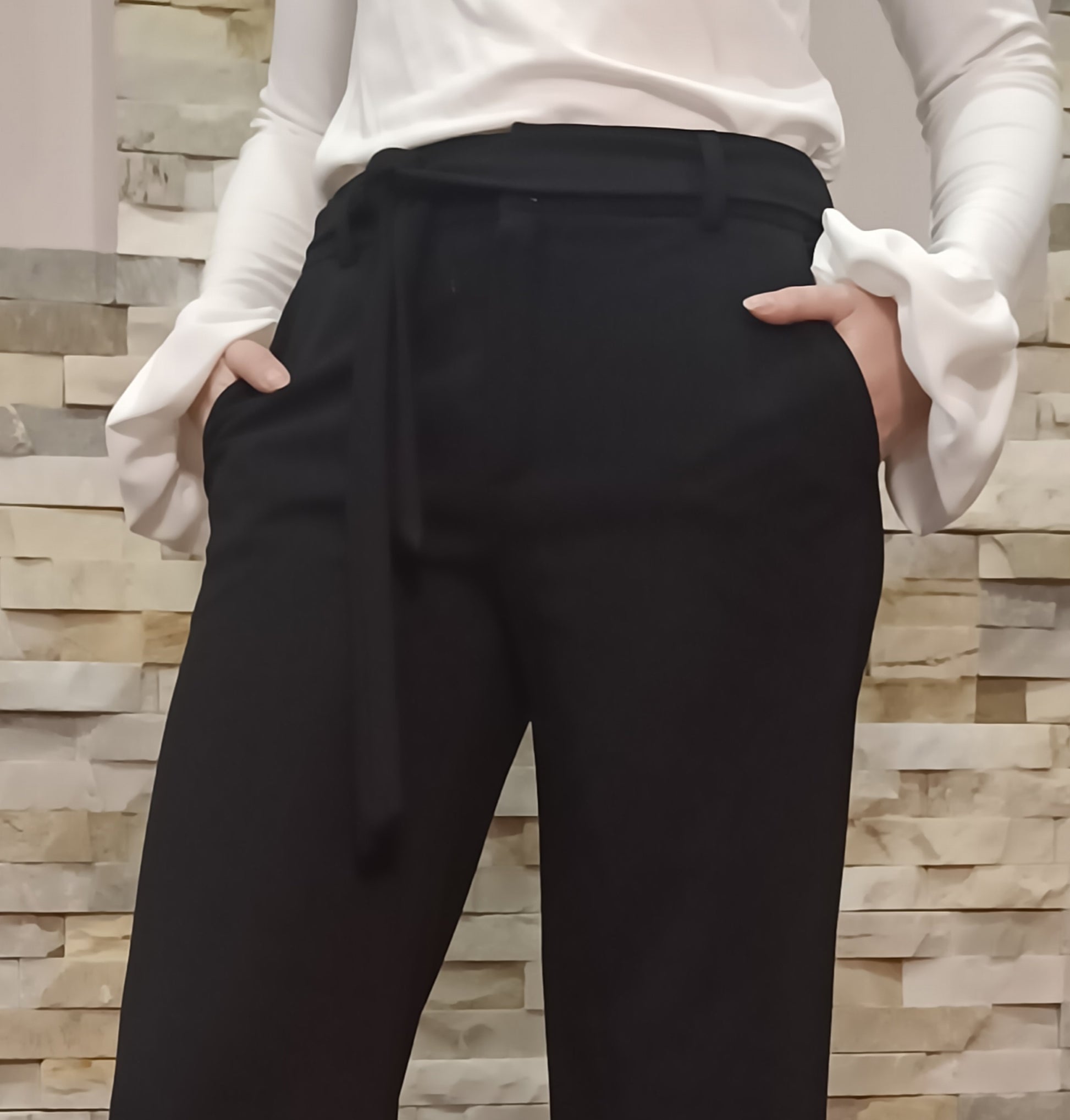 Acești pantaloni evazați negri sunt alegerea perfectă pentru un look elegant și confortabil la birou. Confecționați dintr-un material de calitate, au un design modern, cu talie înaltă și un șnur pentru ajustare. Se potrivesc perfect pentru o ținută office sofisticată, având o croială lejeră care se potriveste oricărei siluete.
