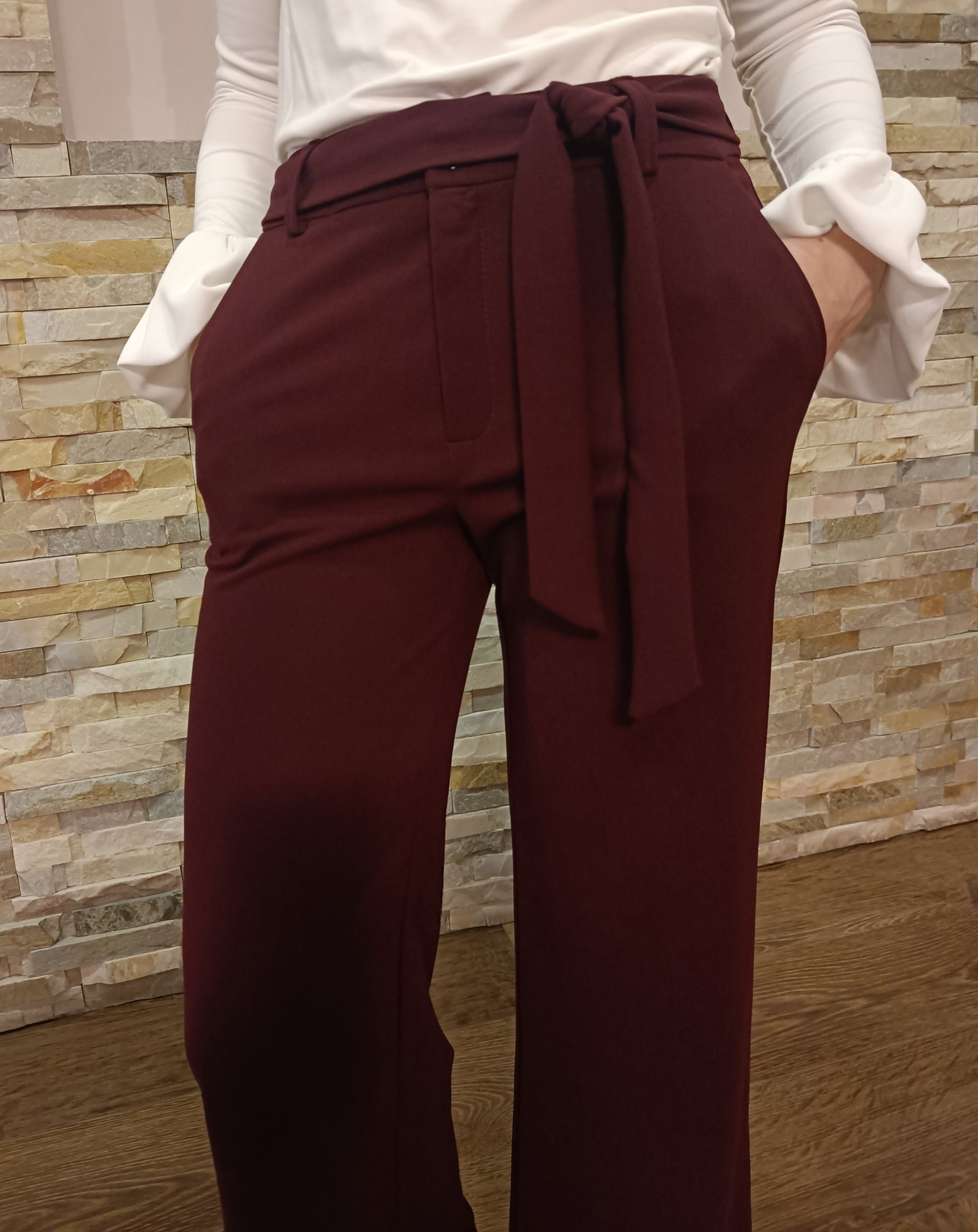 Acești pantaloni evazați burgundi sunt alegerea perfectă pentru un look elegant și confortabil la birou. Confecționați dintr-un material de calitate, au un design modern, cu talie înaltă și un șnur pentru ajustare. Se potrivesc perfect pentru o ținută office sofisticată, având o croială lejeră care se potriveste oricărei siluete.