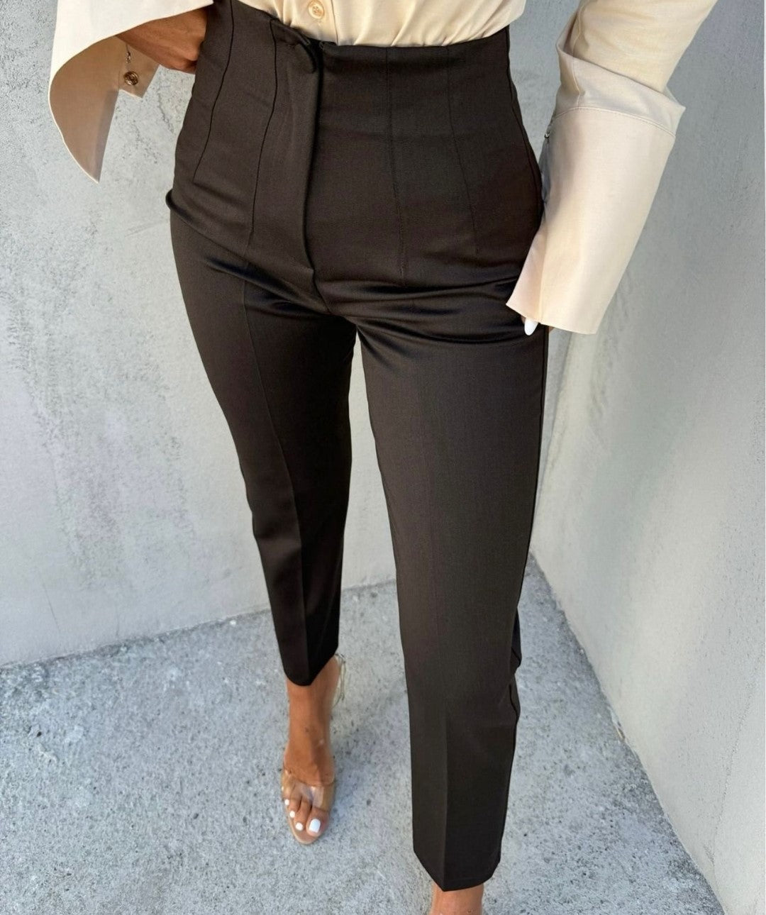 Pantaloni eleganți, cu croială modernă și talie foarte înaltă, perfect pentru ținute office sau smart-casual. Realizați din material structurat, cu pensa și cusături de modelare , acești pantaloni oferă un efect stilizat al siluetei. Dispun de un design cu aspect de buzunar decorativ frontal și un finisaj impecabil ce transmite profesionalism și rafinament.