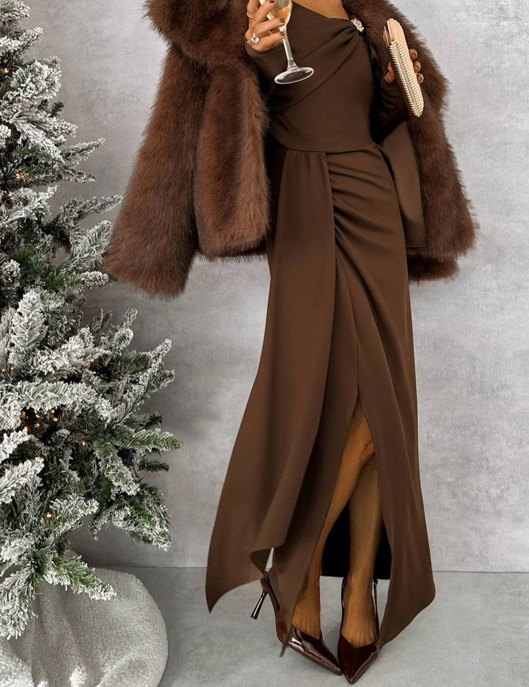 Adaugă o notă de rafinament garderobei tale cu această rochie lungă, de o culoare maro ciocolatiu profund. Designul se remarcă prin drapajele asimetrice elegante și detaliul prețios tip broșă în formă de floare, care oferă un plus de sofisticare. Croiala fluidă și materialul fin,mulat, subliniază silueta într-un mod delicat, fiind alegerea ideală pentru evenimente speciale, cine festive sau ocazii de seară.