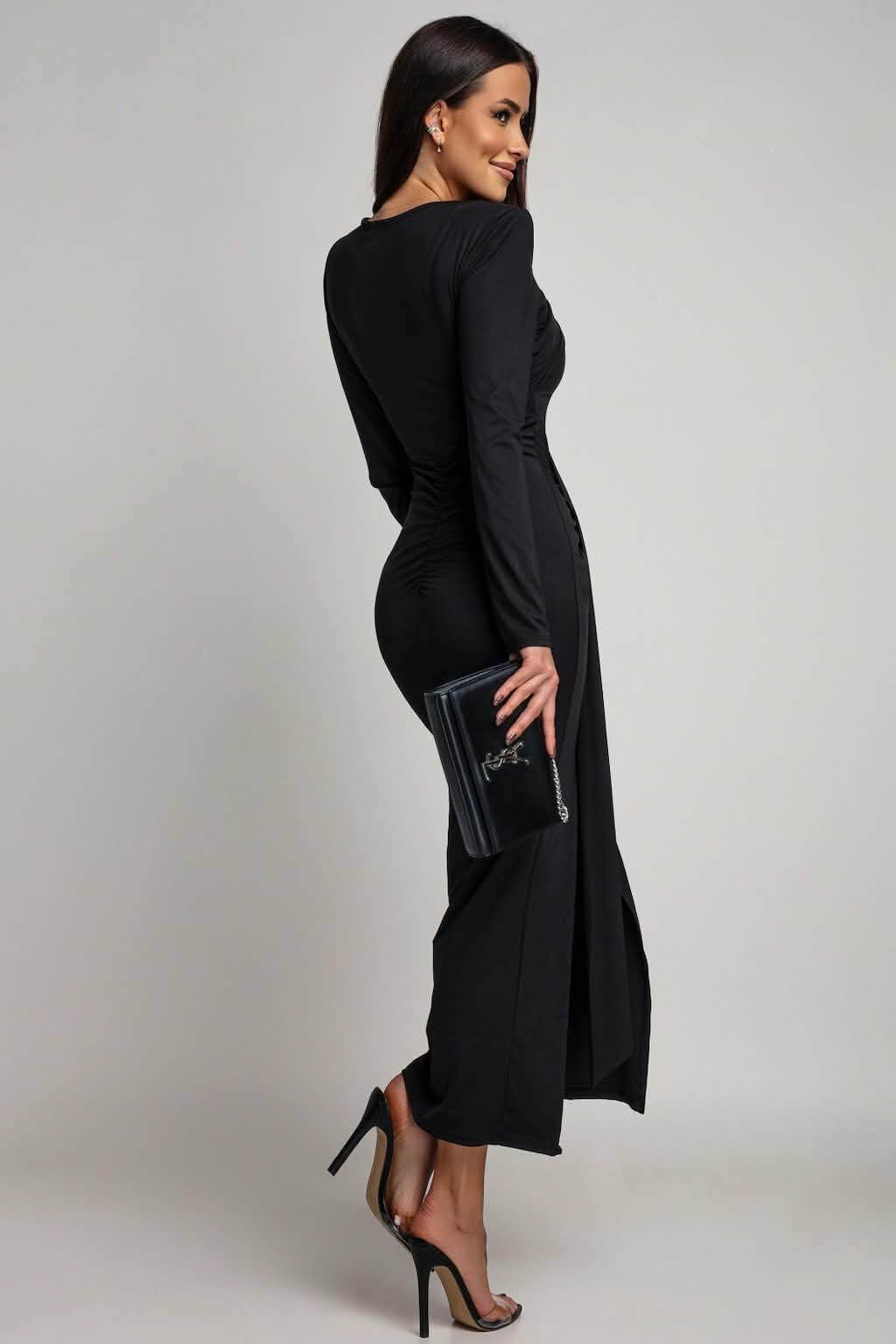 Rochie Elegantă Neagră cu Drapaje și Broșă Florală