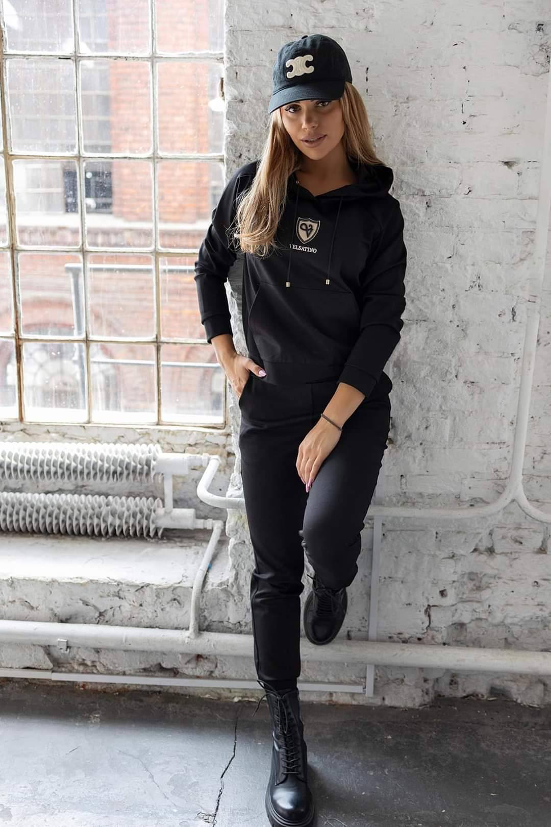 Acest trening negru modern îmbină confortul cu stilul urban. Hanoracul are un buzunar frontal, șnururi metalice și un logo elegant pe piept, iar pantalonii asortați completează perfect ținuta. Materialul bumbac și elastic (80% bumbac, 20% lycra) asigură libertate de mișcare și o purtare plăcută pe tot parcursul zilei. Ideal pentru ținute casual, sport sau streetwear.